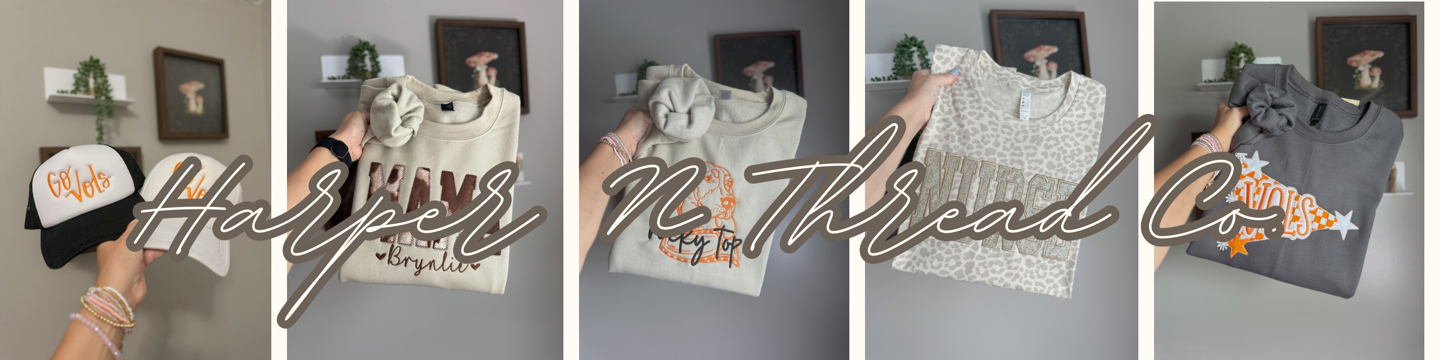 Hi! Thanks for being here. My name is Bella and i am the owner of Harper N Thread Co. I am a mama to my 3 year old daughter and married to my wonderful husband. I started my small business back in December of 2021 with a single needle embroidery machine. It started as just a hobby and something i just loved to do, from that it turned into people actually liking my products, and that is when i started my small business. At first i was just selling to friends and a group on Facebook, and then ventured out and posted my items on etsy, and people LOVED them. I got to upgrade to a multi needle machine which opened up so many new doors to me, and was able to find so many new ways to share my creativity and designs. My etsy did so well i decided to go ahead and make a website, so here i am today. All because i have the absolute best customers and supporters. So from the bottom of my heart THANK YOU! Without you all i would not be here today being able to make my dreams come true.