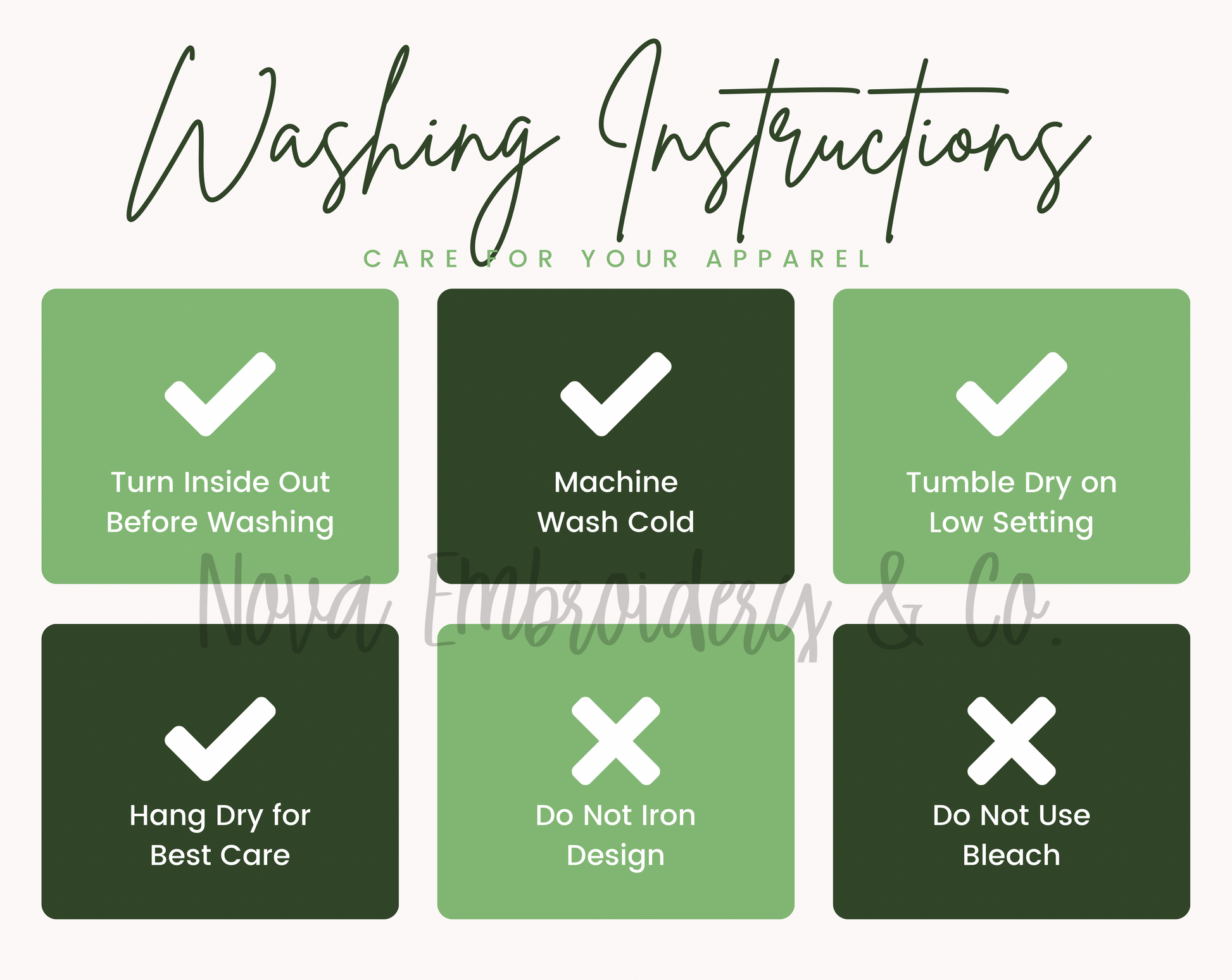 Wash all items inside out, on cold, lay flat or hang to dry. We are not responsible for damaged items that are not properly cared for.