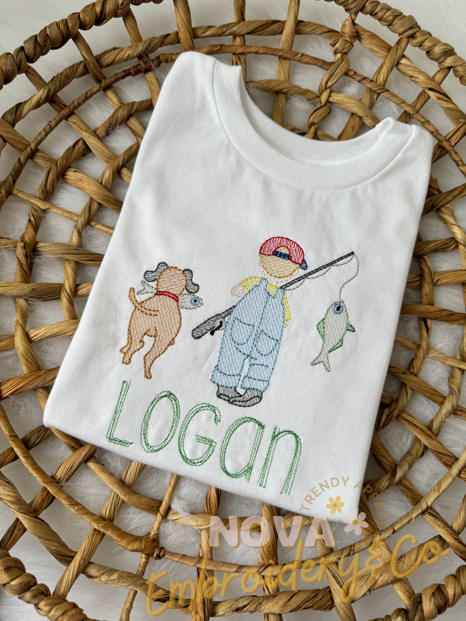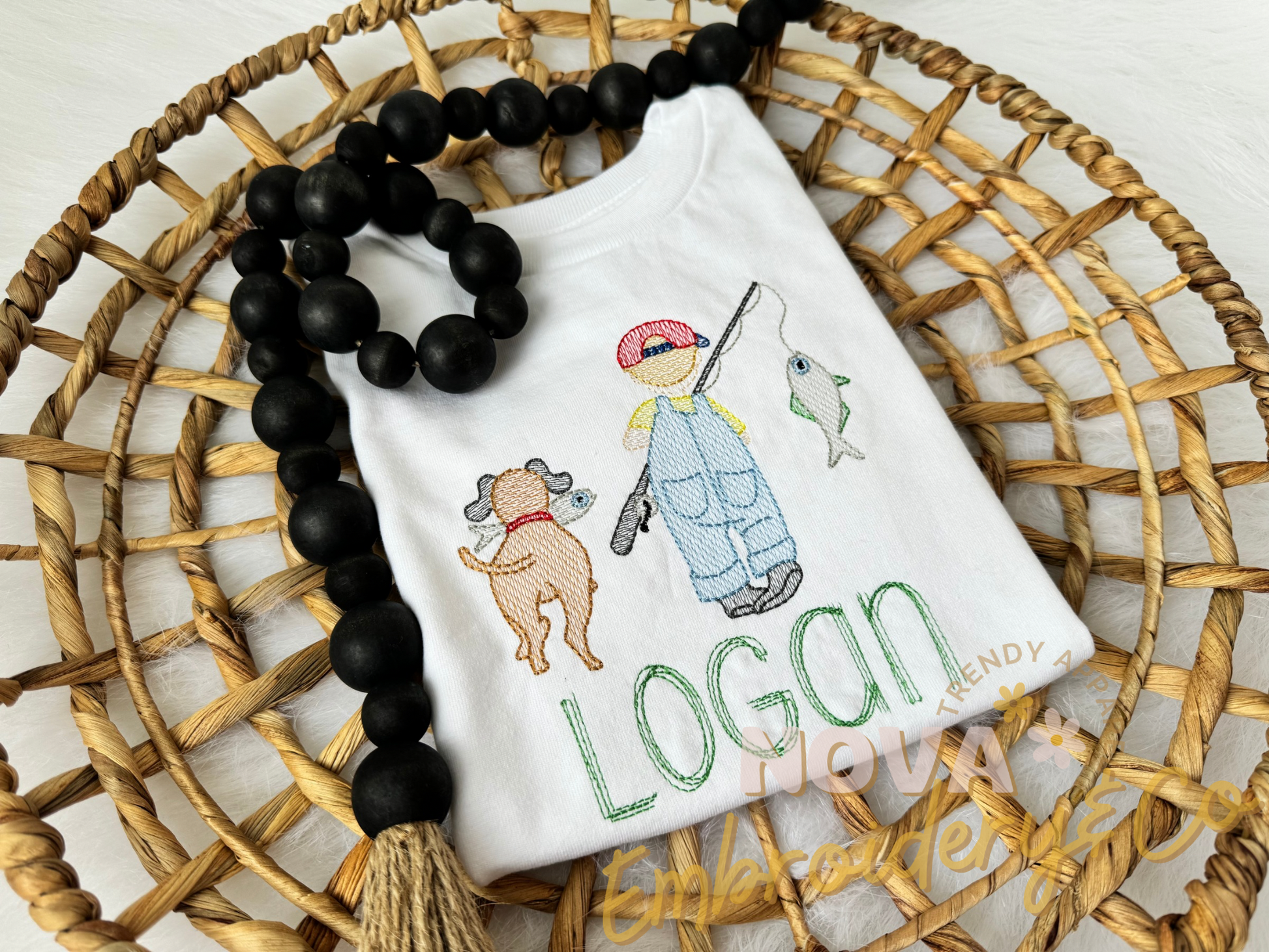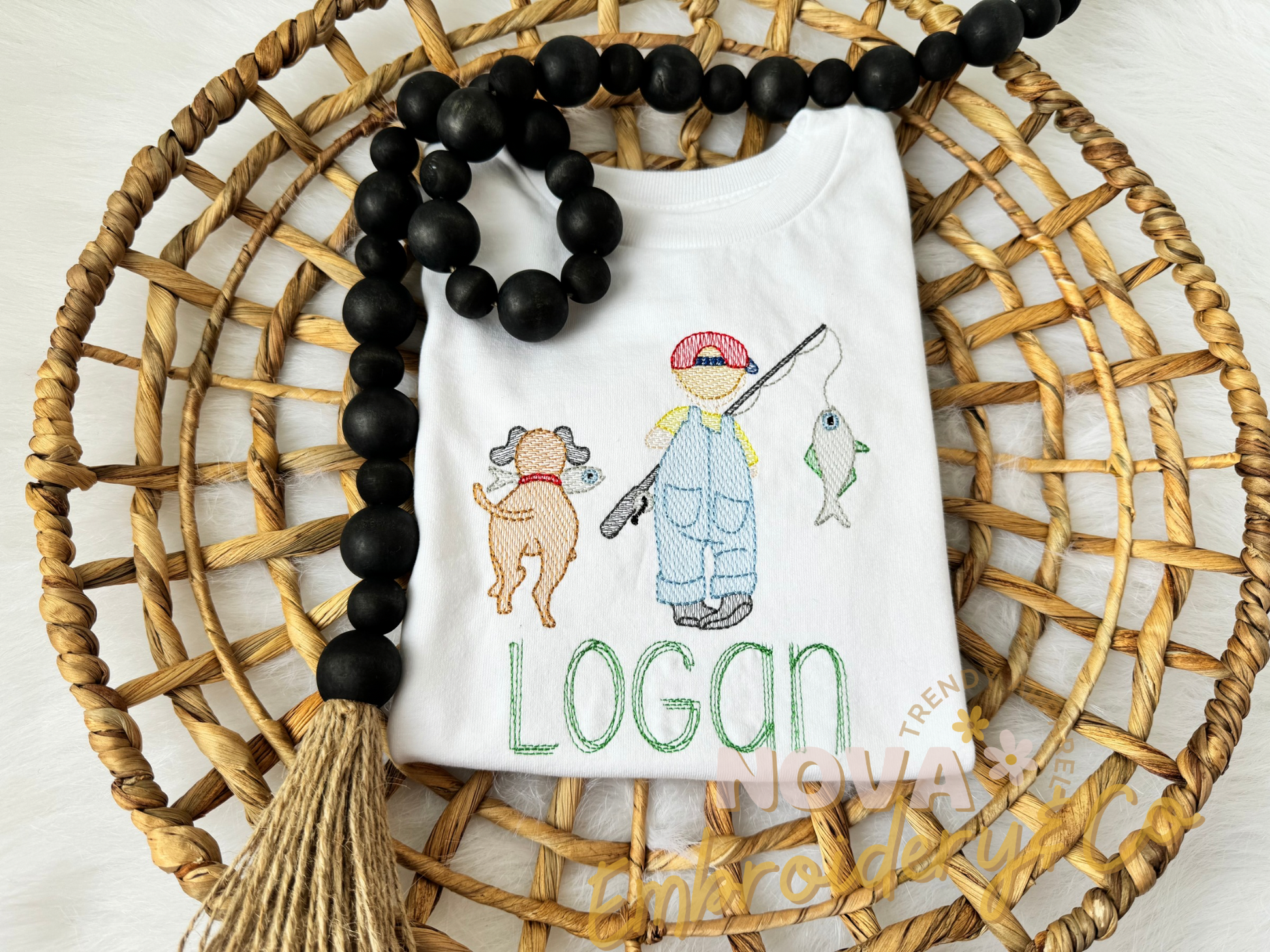 Kids/Toddler Boys Short Sleeve, Romper, and Sun Bubble with cute customizable Fishing design. This design is embroidered on with your kiddos name underneath the design🎣