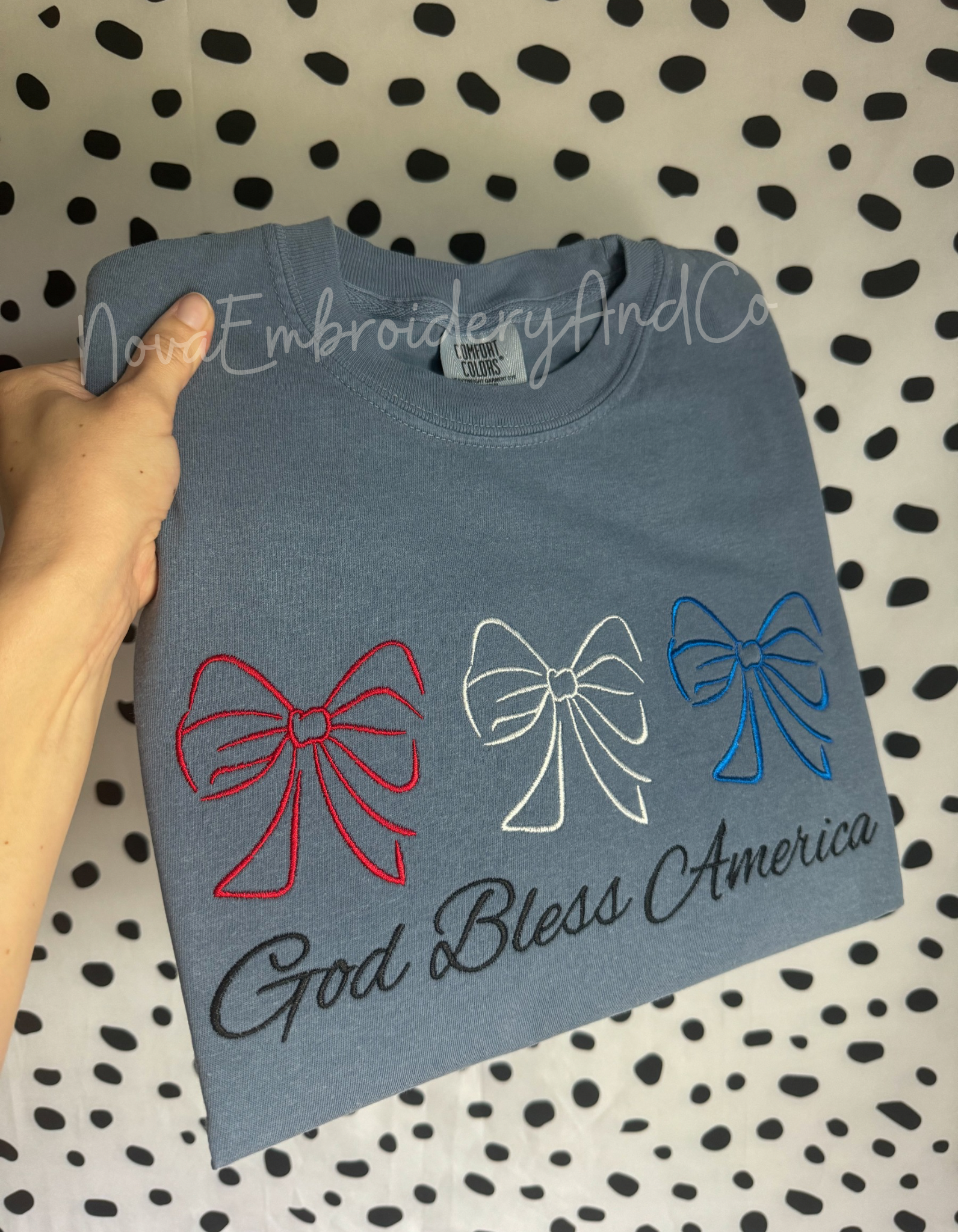 Embroidered Red White an Blue Bows on a comfort colors tee! This is the perfect simple tee to add to your collection for memorial day, 4th of July, or even just a basic everyday tee!