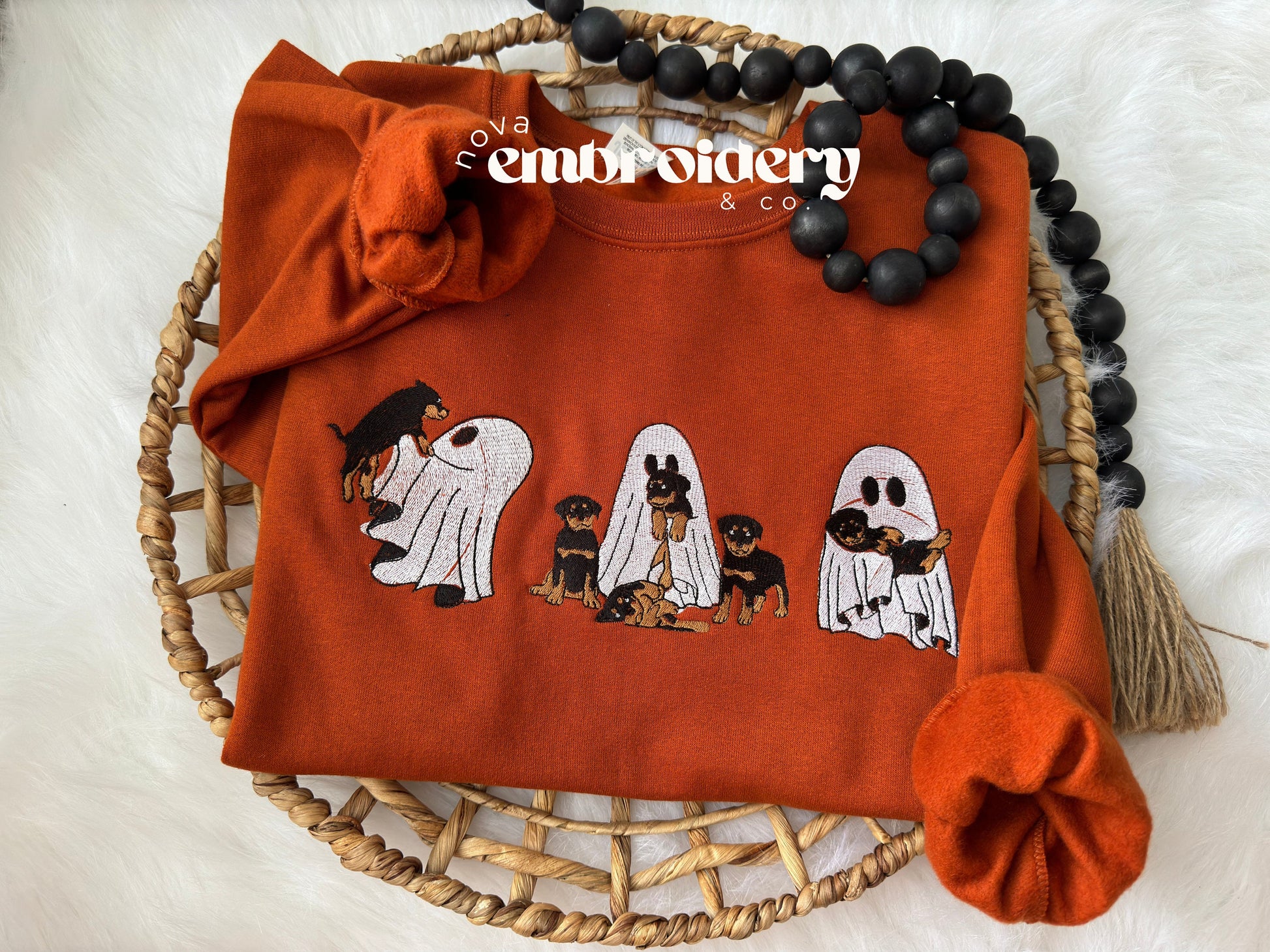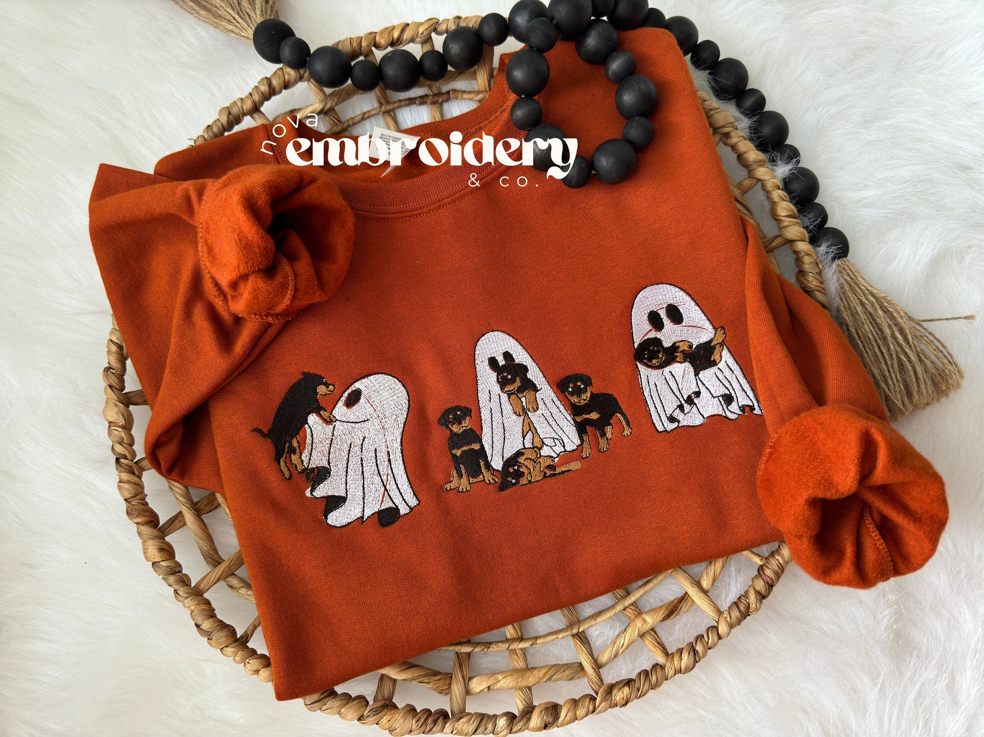 Fun Embroidered Rottie Ghost Design 🧡🖤 If you are interested in a different color sweatshirt or Tee, please don’t hesitate to message me and I can almost always accommodate requests🥰