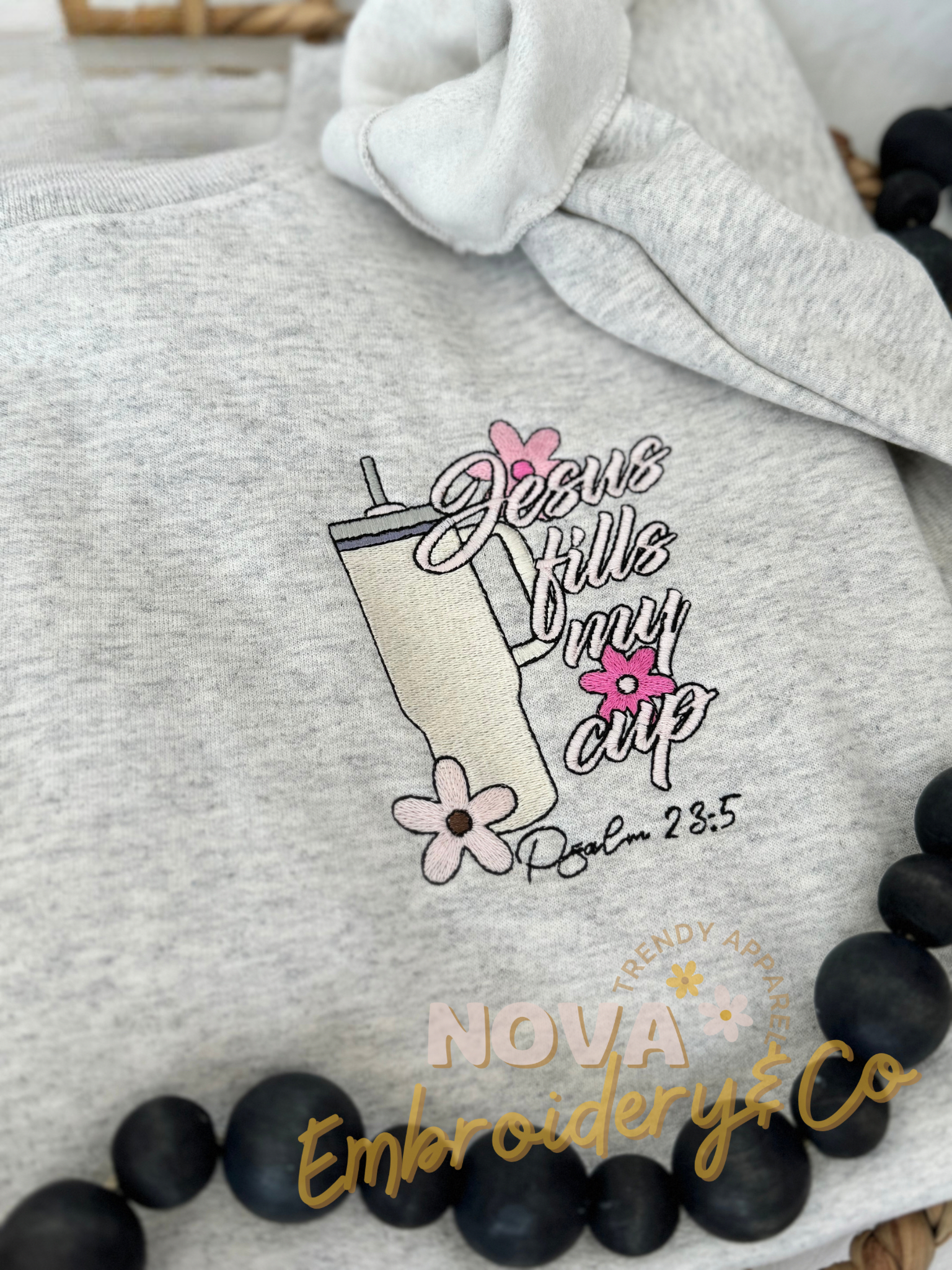 Embroidered “Jesus fills my cup” T-Shirt/Sweatshirt design is on left chest as where a pocket would be
