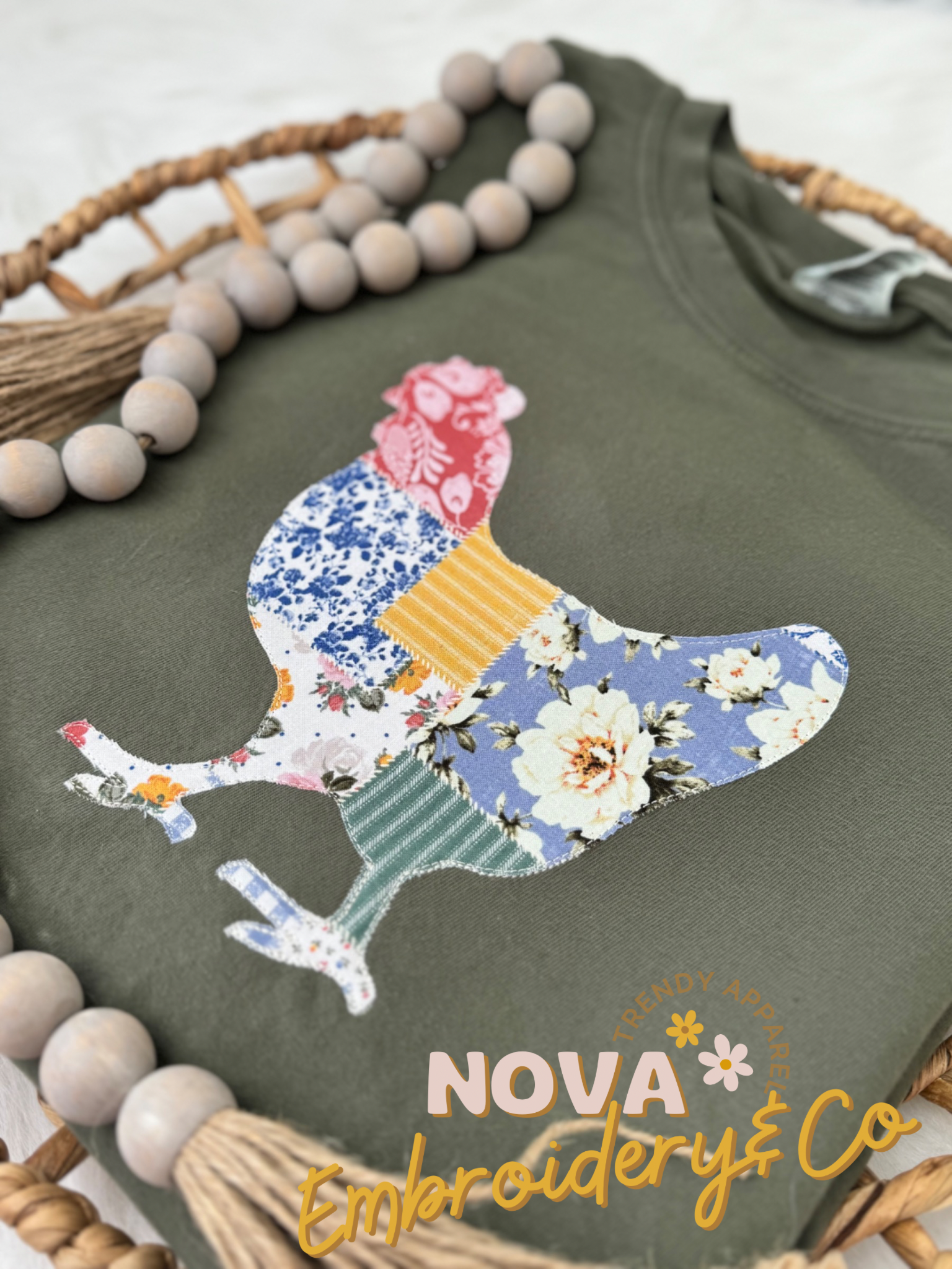This appliqué Shirt/Sweatshirt had a beautiful patchwork/quilt fabric embroidered on the Tshirt/ Sweatshirt with this cute chicken design. It gives the best farmhouse look, and you can’t pass having this up🤍🤍
